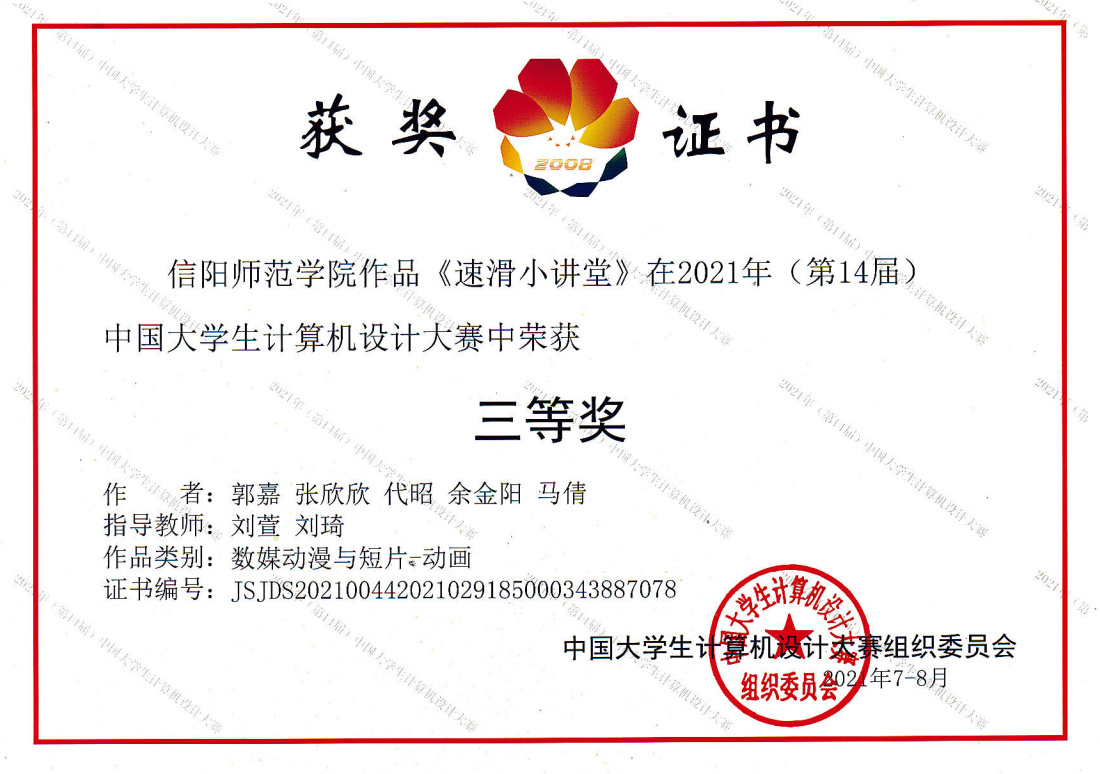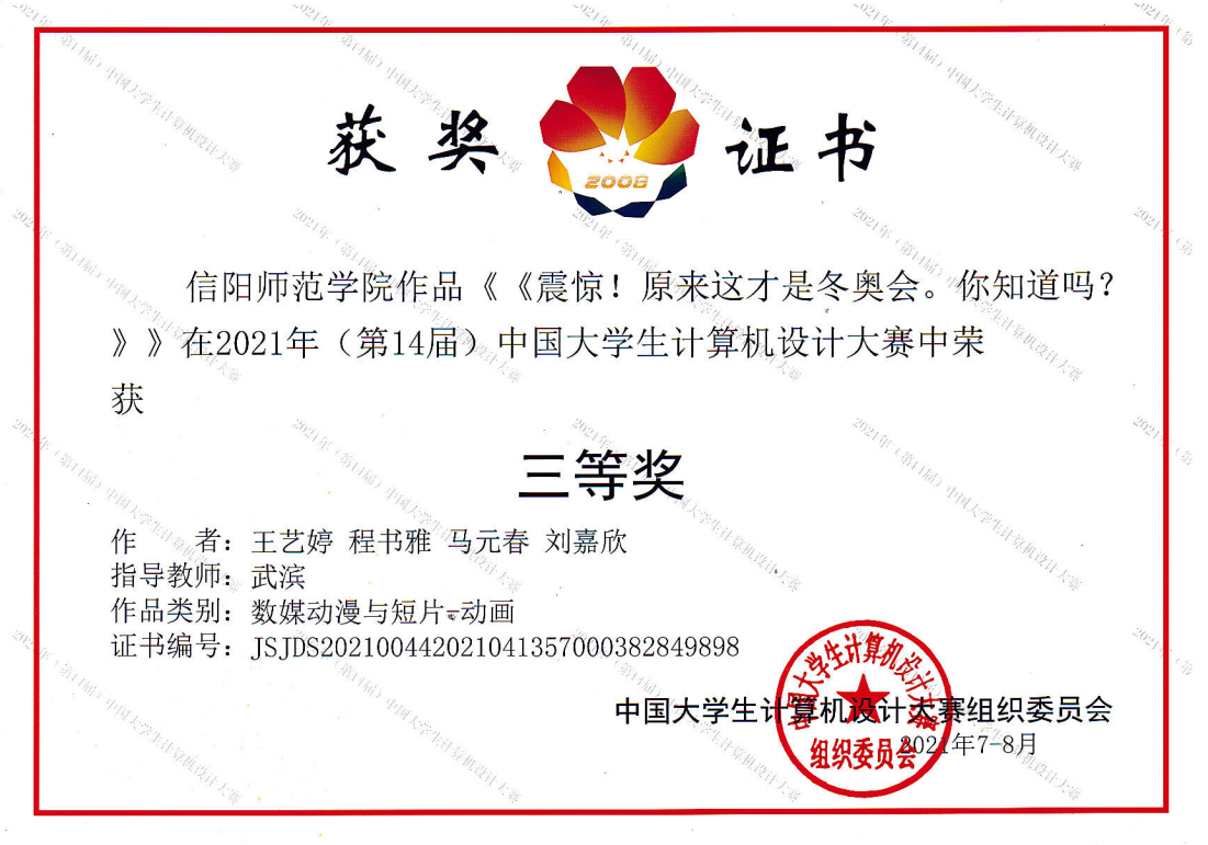 时间:2021-10-05 18:20:28 来源:英国365集团官网 作者: 阅读: 次近日,由国家教育部主办的2021年第十四届中国老员工计算机设计大赛落下帷幕,在厦门决赛赛区数媒动漫与短片普通组比赛中,公司两组作品经过河南省大赛推选,与全国上百所高校参赛作品进行角逐,最终脱颖而出,均荣获国家级三等奖。获奖作品是由公司教育技术系老师武滨指导,王艺婷、马元春、刘嘉欣和程书雅完成的动画作品《震惊!原来这才是冬奥会。你知道吗?》,刘萱、刘琦老师指导,郭嘉、张欣欣、代昭、余金阳和马倩完成的动画作品《速滑小讲堂》。