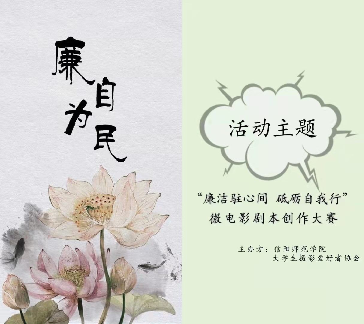 时间:2022-05-01 12:57:07 来源:英国365集团官网教科院新闻部 作者:周媛媛 齐家乐 阅读: 次为迎接党的二十大胜利召开,大力弘扬廉洁清风,营造以廉为荣的良好风尚。2022年4月13日至4月30日,信阳师范公司老员工摄影爱好者协会特举办“廉洁驻心间,砥砺自我行”微电影剧本大赛暨河南省“喜迎二十大,清风满中原”短视频校级选拔赛剧本征集活动。