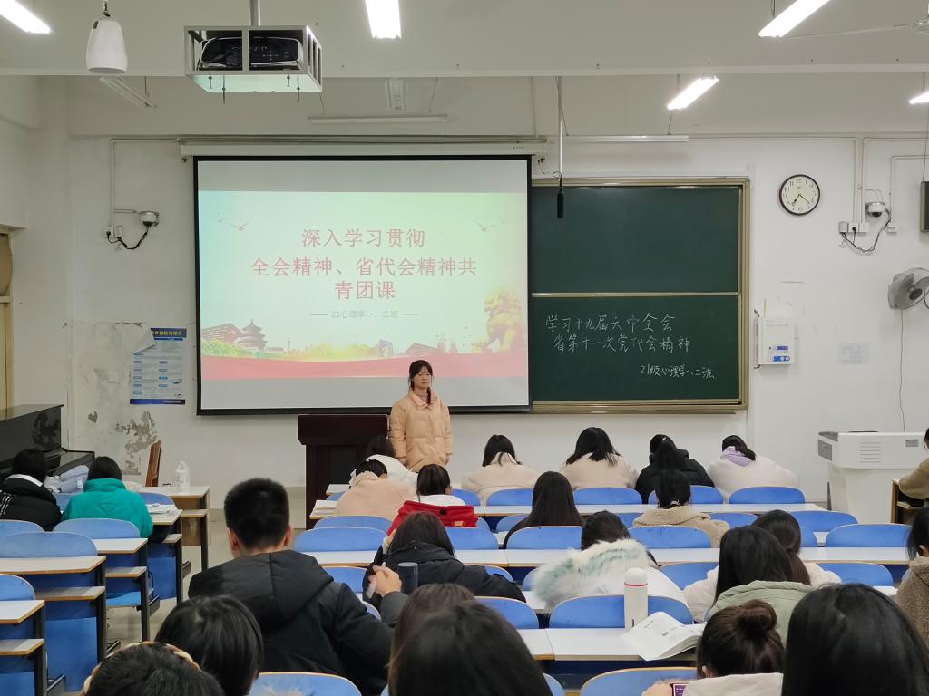 团课正式开始前,各团支部全体起立奏唱团歌,随后,各班认真观看“十九届六中全会精神”和“省第十一次党代会精神”的相关视频,团支书深刻解读十九届六中全会精神和省党代会精神,并由优秀团员代表进行发言。其中,2019级教育技术学班优秀团员代表任旭指出,十九届六中全会是一次具有开创性、里程碑意义的重要会议,作为新青年老员工,我们要紧跟中国共产党的步伐,从百年党史中汲取智慧力量和宝贵经验,锤炼过硬本领,当好党光荣传统和优良作风的忠实传承人,用理想信念之光照亮矢智奋斗之路。团课最后,广大团员交流学习收获和感想,纷纷表示作为新时代青年,要坚定理想信念,脚踏实地,勤学奋进,学好文化知识,将党的十九届六中全会精神和省党代会精神化为激励自身前行的强大动力,在新征程中书写青春华章。