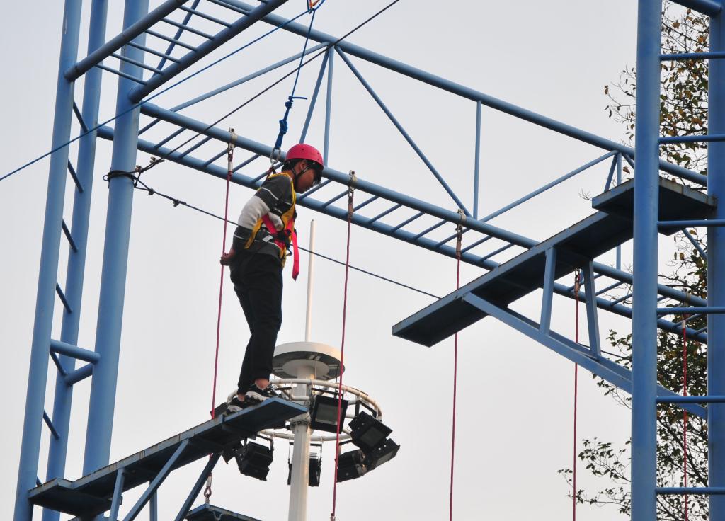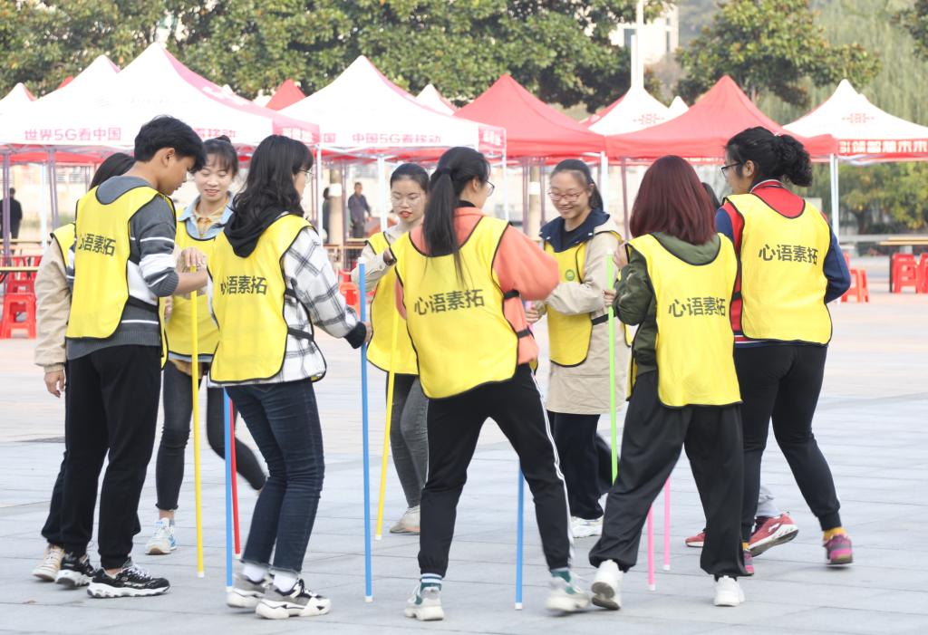 活动伊始,工作人员将参赛者按照班级分成三组,并向他们讲述了游戏规则和注意事项,从而保证同学们安全而顺利地完成游戏。接着,“高空断桥”、“信任背摔”、“模拟电网”等一系列素质拓展活动依次开展,同学们紧张而兴奋地投入其中。刺激而有趣的游戏不仅引发现场笑声不断,也使同学们收获良多。其中,在“高空断桥”环节,同学们从开始的害怕,到最后勇敢的挑战,迈出了重要一步;在“接力传送”环节,同学们合理安排传球顺序,团结合作,高效地完成了任务。最后,在工作人员的鼓励下,同学们纷纷表达自己对此次活动的感想,现场氛围十分热烈。