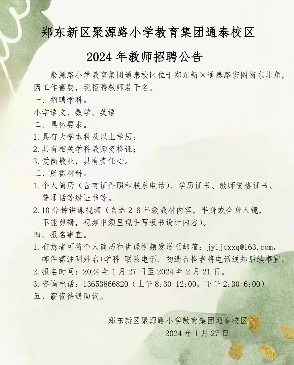 郑东新区聚缘路小学教育集团通泰校区2024年教师招聘公告