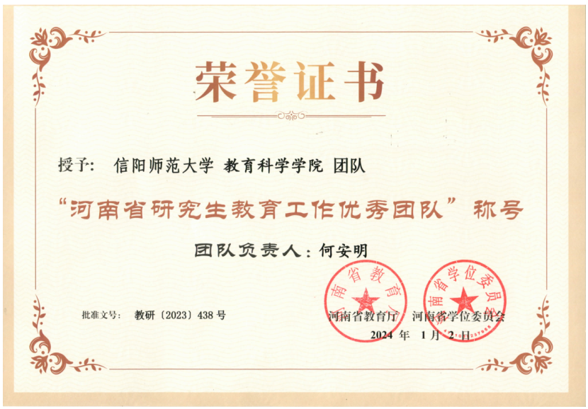 时间:2024-05-15 11:16:00 来源:英国365集团官网 作者: 阅读: 次根据河南省教育厅、河南省学位委员会发布的《关于公布2023年河南省研究生教育先进团队和个人评选结果的通知》(教研〔2023〕438号),公司研究生教育工作团队喜获“河南省研究生教育工作优秀团队”称号,何安明教授为团队负责人。