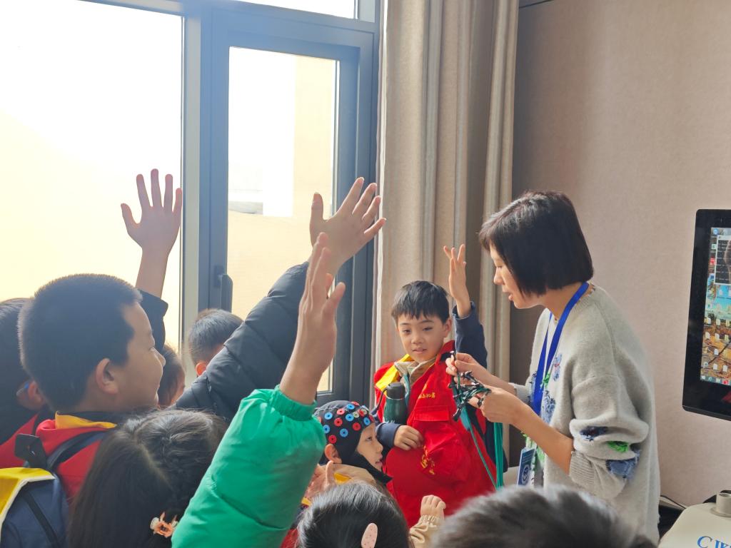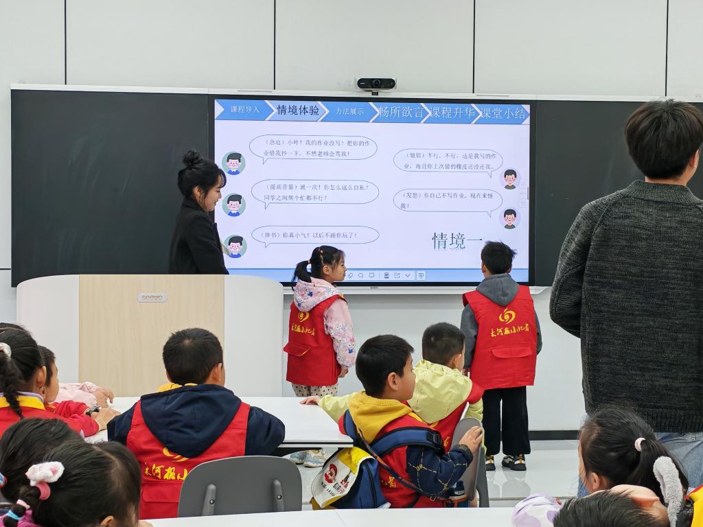 在第三模块的心理健康课堂体验活动中,齐新瑞以《学会拒绝》为题,教授孩子们如何在尊重他人的同时保护自己;李馥杉通过讲授《探寻生命的意义》课程,引导小记者们思考生命的价值与意义。课堂上,孩子们踊跃发言、积极互动,展现出对心理健康知识的浓厚兴趣。王祥坤老师在组织大家体验随后的科普宣讲环节活动,进一步增进了小记者们对心理健康课程和心理科学知识的认识。