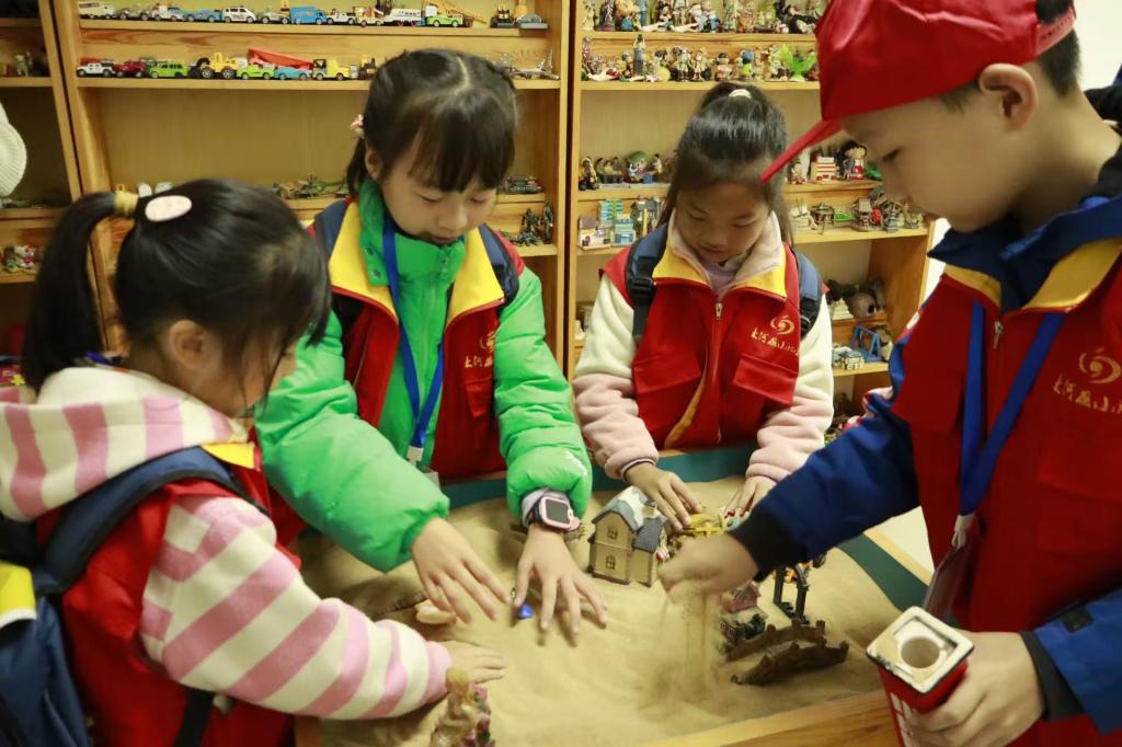 在参观第一个模块的活动时,小记者们在志愿者的带领下,依次参观了音乐治疗室、游戏治疗室和沙盘治疗室。在音乐治疗室,小记者们在朱欲晓老师的引导下,通过敲击乐器、聆听旋律,感受音乐对情绪的调节作用;在游戏治疗室,他们在彭凡凡老师的带领下,通过角色扮演和互动游戏,学习表达与沟通技巧;在沙盘治疗室,孩子们在李龙珠老师的引导下,用沙子和模型构建内心世界,释放情感、激发创造力。