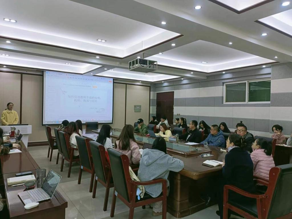 研讨会开始,部分员工展示自己的论文,在座老师进行指导。在分享的过程中,金老师就教师幸福指出:“幸福有主观、客观的区别,个体对于幸福的认识不一样,得到的结果也不一样。”对于高质量教育公平方面,邢老师提出:“高质量公平有没有具体的标准?加不加高质量这个词对于论文有何影响?”接下来,教师们对于教师交流轮岗展开激烈的探讨,杨老师指出“教师交流轮岗制度可以促进教育均衡发展,但这对于教师个人而言是否正义?”张老师说:“所处环境不同,对于教师交流轮岗的看法也不一样。采取哪些轮岗政策应立足于实践,要证实策略的合理性,而不是根据自己的想象去提策略。”关于员工批判性思维培养方面,武老师说:“如何促进员工批判性思维的发展,我们通过引导员工与人工智能的对话来发展员工的批判性思维。通过使用AI来引导员工发展批判性思维。”