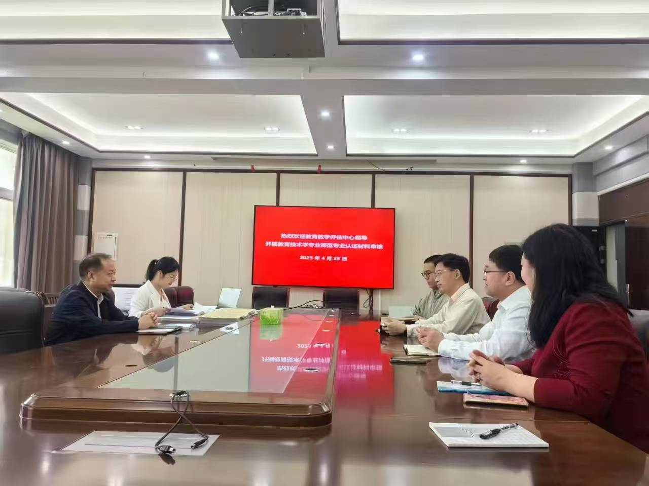 2025年4月25日,教育技术学专业开展师范专业认证材料审核工作,公司公司产品评估中心主任余国忠、科长胡月,公司党委书记房加帅、副经理郭勇、教育技术学系主任崔宇路、教学秘书刘萱老师参加此次会议。